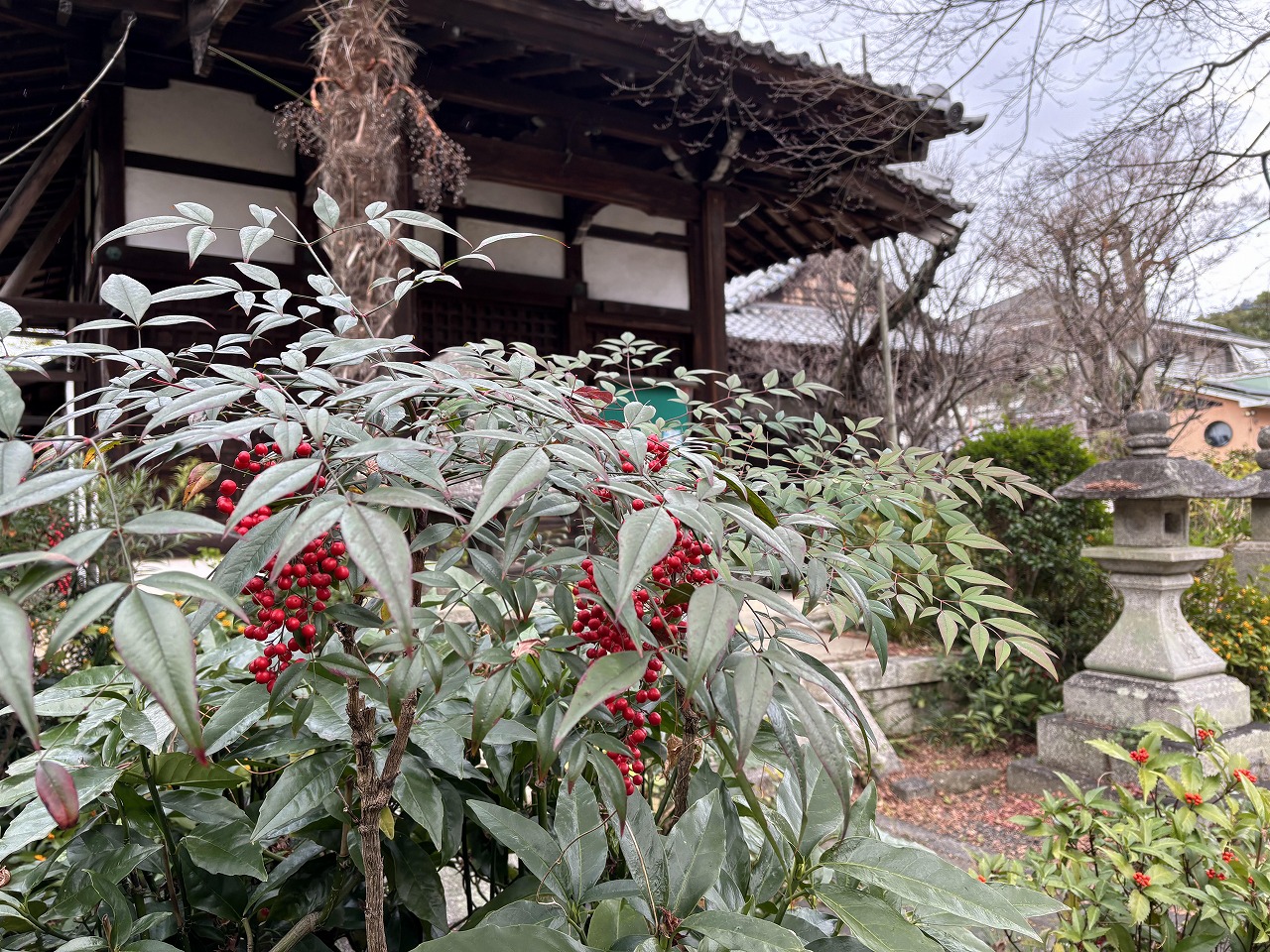 また、風水においても「難を転じて福とする」ということから、盗難除けや火災除けに効果があるとされ、鬼門(北東)や裏鬼門(南西)の方向に植えると良いとされています。東北院におきましても、本堂から見て裏鬼門(南西)の方向に、南天(ナンテン)が植えられています。