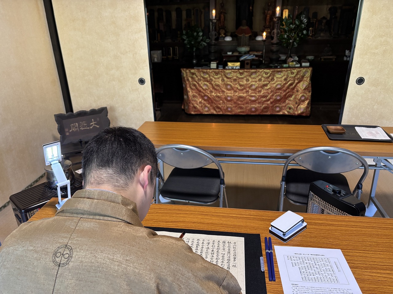 日本が世界に誇る伝統文化である能を、真謡会館で学んでおられる方が、12月13日(土)にお写経に取り組まれました。真謡会館で謡蹟巡り部を担当されており、謡曲「東北(とうぼく)」の題材となっている、和泉式部が手植えしたと伝わる「軒端の梅」にも関心を持っていただき、東北院に複数回参拝していただいております。また、今年の3月には真謡会館で学んでおられる13名の方々と分林道治先生が、謡曲「東北」を当院の本堂においてご奉納していただきましたが、その時にも中心的な役割を果たしておられました。
