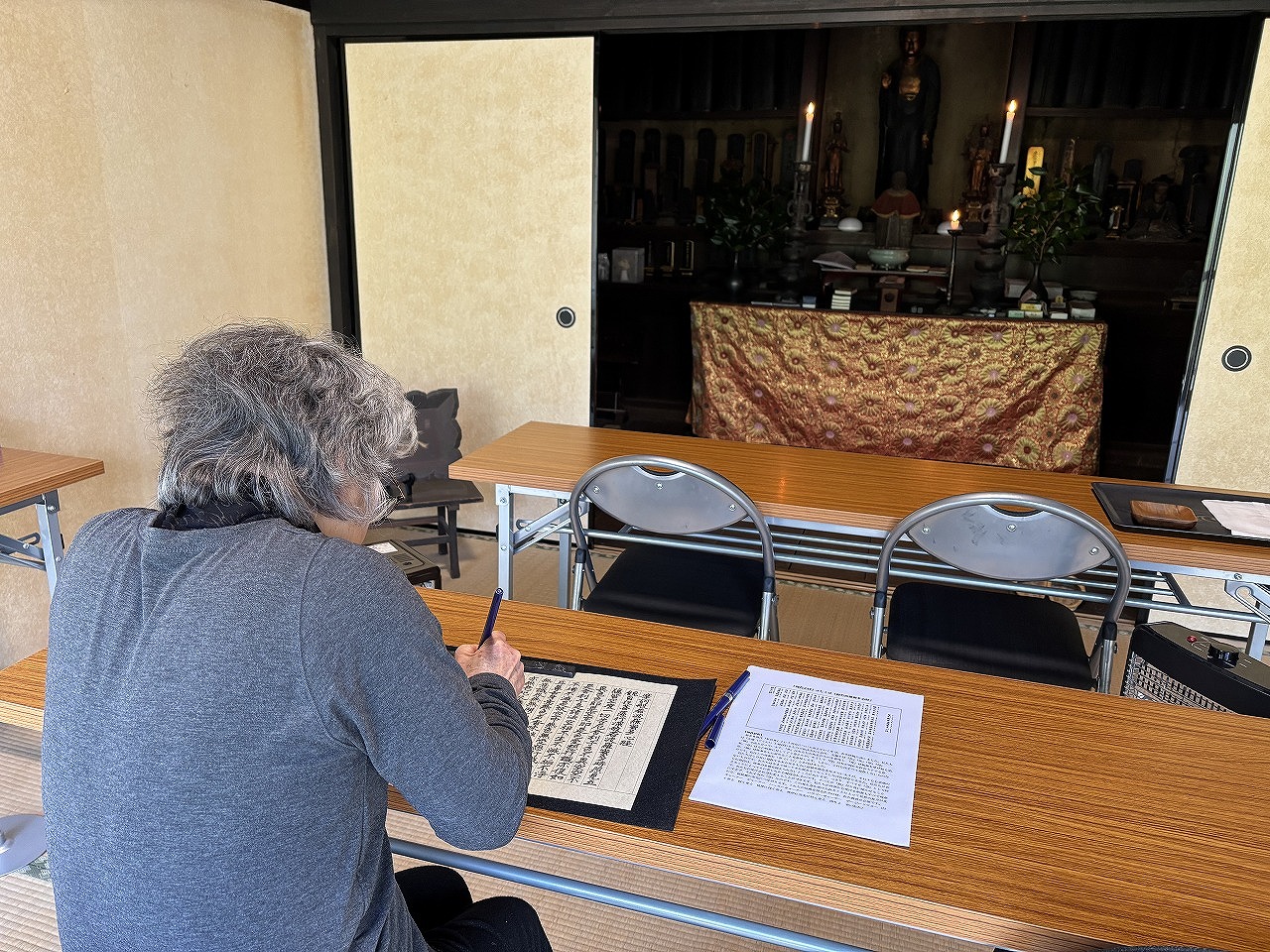 百萬遍知恩寺さまで「一枚起請文」のお写経されたことがあるとのことでございました。当院では「般若心経」をお写経していただきますので、262文字の最も愛されてきたお経の意味について、ご説明させていただきました。その後、静寂な中ご自身と向き合い清浄としたお気持ちになれるように、一字一字丁寧に書き写されていました。書き上げらた「般若心経」は、本堂に御奉納していただきました。お写経していただいたことで、少しでも心が軽やかになっていただけましたら幸いでございます。
