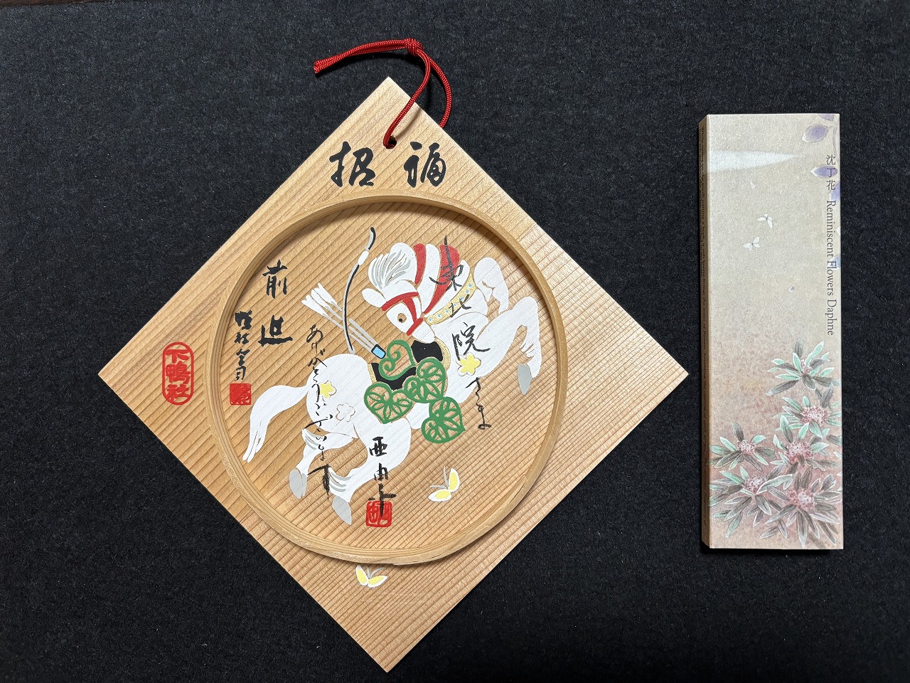やわらかな日差しが差し込み、春の訪れを感じられた昨日(令和8年3月1日)、日本画家の定家さまが当院にお越しになりました。昨年の3月中旬に、春を告げる沈丁花の香りにさそわれて、当院にご参拝なされました。その際に、参道に咲く沈丁花をスケッチされていましたが、その絵がお香のパッケージの一つになったとのことで、そのお品と午年の絵馬を御奉納していただきました。